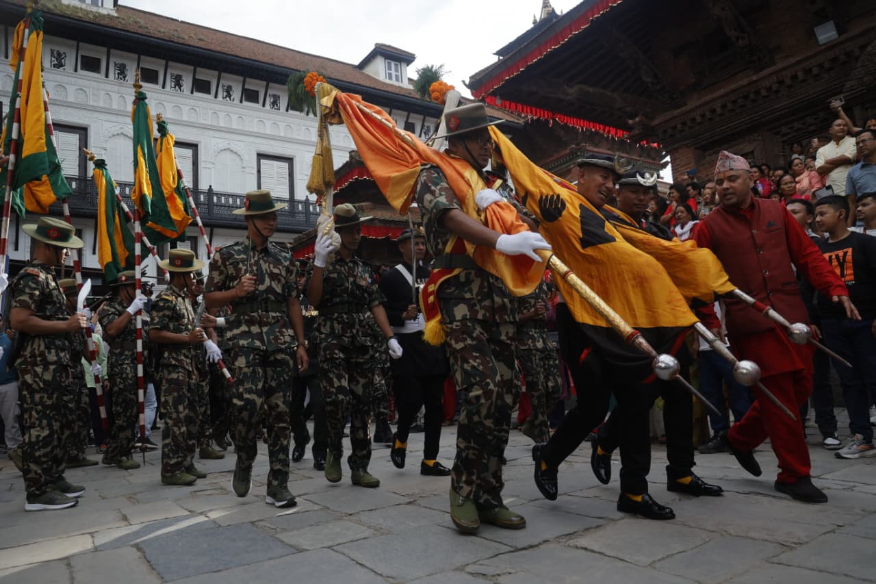 Kathmandu. Flower arrangements were brought to the Nava Durga shrine set up in the puja room and Dashain house this afternoon on the seventh day of Ashwin Shukla Saptami.